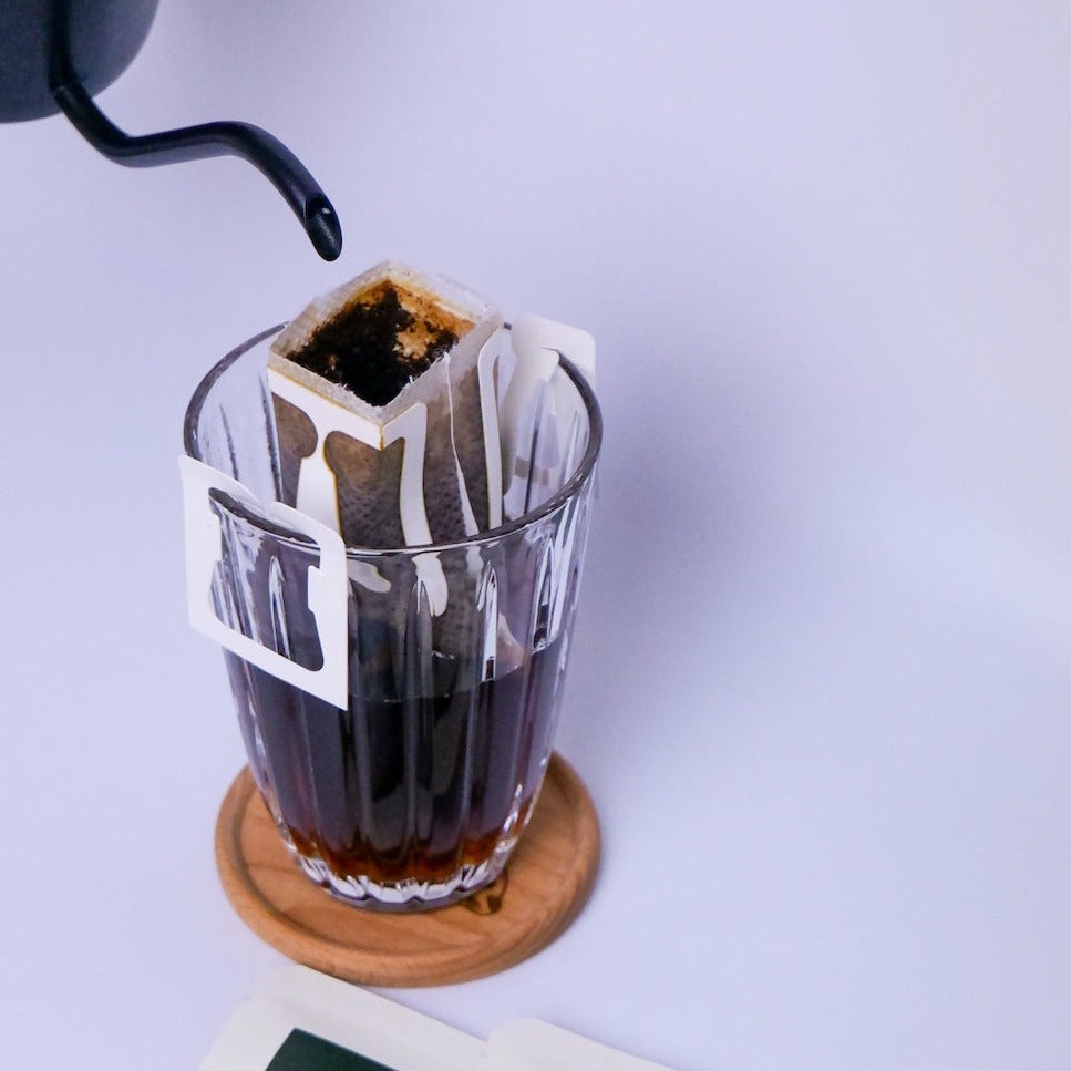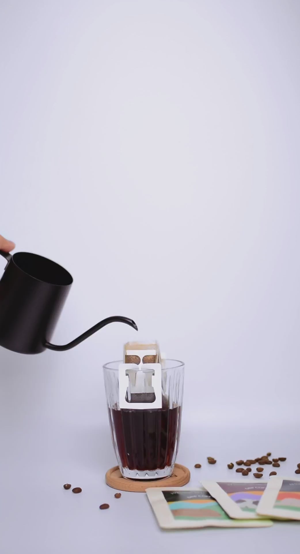 Gantungkan 1 beg kopi drip pada cawan, tuang 180ml air panas dan biarkan curam selama 3-5 minit.